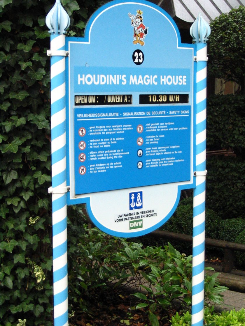 Hersteller: Vekoma (NL) Typ: Mad House (80 Plätze) Premiere: 1999 Betreiber: Bellewaerde (Ieper, B) In Bellewaerde hat man bei der Thematik des Mad Houses auf den Entfesselungskünstler Harry Houdini zurückgegriffen. Im Preshowraum erhält man bilingual (Niederländisch / Französisch) einen kurzen Filmvortrag über den Werdegang des Künstlers. Offenbar schwebt jedoch der Geist des Verstorbenen noch über dem Haus, aber da hakt bei mir auch schon der weitere Verlauf der Geschichte, die im Inneren weitererzählt wird. Bilanz der Vekoma Mad Houses |