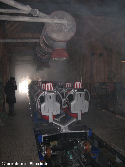 Die Umlaufzeit beträgt 3:20, das bedeutet in 3:20 sind alle Züge einmal rundrum gefahren. Da die Bahn 5 Züge (und 6/7? Blöcke) hat, kann man für jeden Teil um die 30-40 Sekunden rechnen, der Zug wird vielleicht noch im Darkrideteil zu stehen kommen ect... Am Mittwoch fuhren nur 2 Züge. Die "Doppelladestation" sind nicht 2 paralelle Statinen, sondern wie bei Desert Rita 2 Blöcke hintereinander. Da wie gesagt nur mit 2 Zügen (Mindestzuganzahl) gefahren wurde, stieg man aber am selben Ort ein und aus. In der Station stand zwar schon ein Drehkreuz, doch die ganzen Abspergitter, die die Aus- von der Einstiegsstaion trennen, wurden noch nicht montiert. Wie du auf diesem Onride-Video siehst, kommt von beiden Seiten Nebel, zusätzlich kommen von 4 Rohren von oben immer mal wieder Nebelstösse, siehe Bild. Der zug wird also gut in Nebel eingehüllt. Also es wird schon gut genebelt da drin. Quelle: onride.de onride-upic293767@640 P.s. bei dem Ecam-Onridevideo, als der zug zurück in die Station fuhr,da steht jemand in der ersten Reihen, das bin IIIICH |