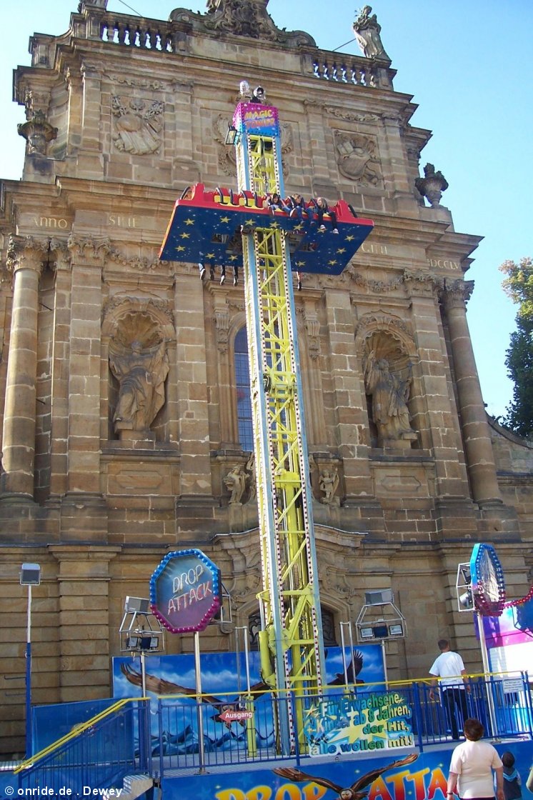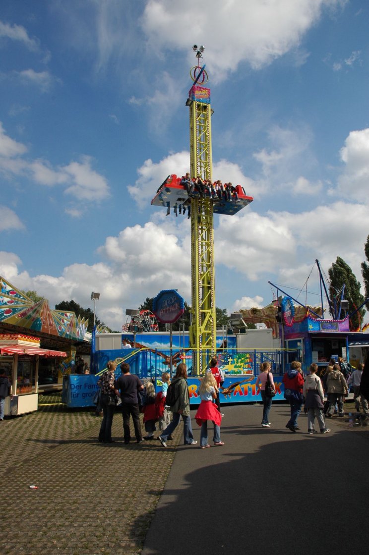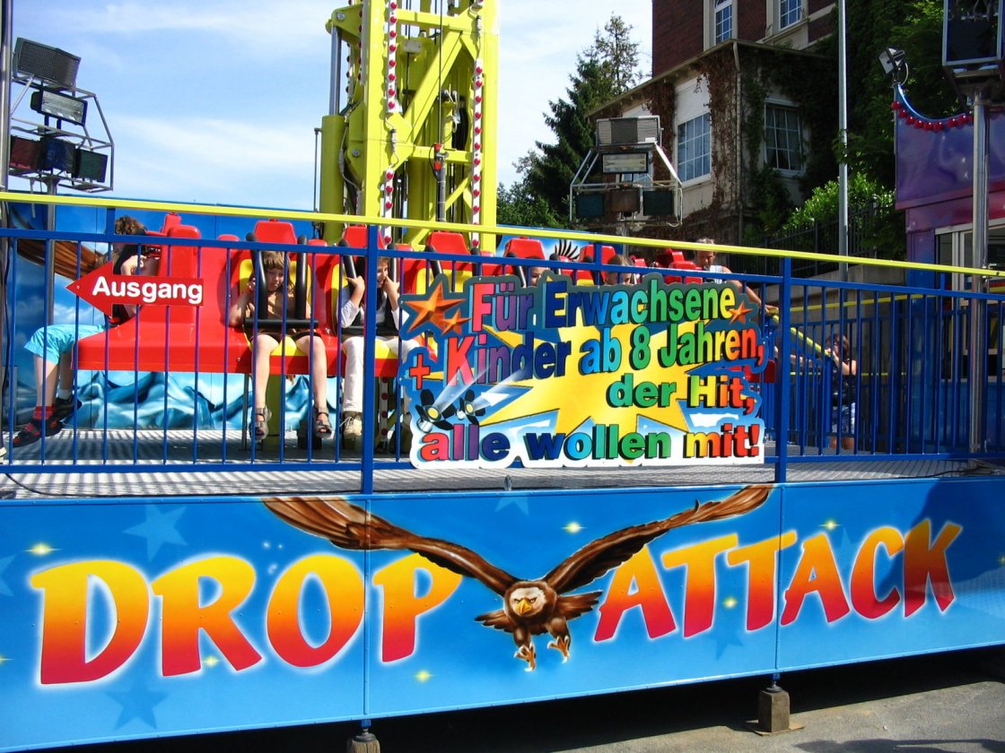 Der Turm ist 20m hoch. Fallen tut man laut Betreiber 15m. Aber das hab ich Lauterbach nicht gesehen. Man fiel höchstens 10m. Erst fährt so hoch, wie es geht und dann fählt er runter und macht in der Mitte des Turmes Jojo-Effekte. Die Fahrt war nicht lang. |