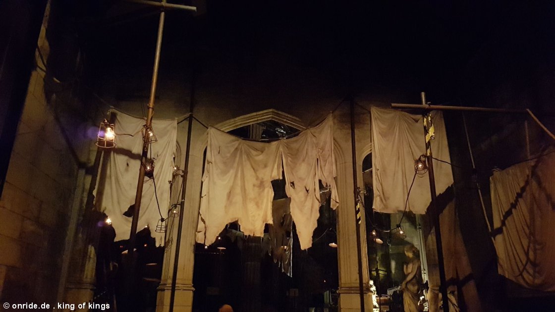 So waren wir wie erwähnt nicht rechtzeitig am Haupteingang. Weiter ging es für uns rechts herum und direkt ins Kinderland, wo eine der beiden nahe beieinander liegenden Kapazitätsgurken auf uns wartete: Octonauts Rollercoaster Adventure Die Abfertigung war leider nicht die schnellste und die Queue recht voll, sodass wir hier direkt mal über 20 Minuten am Kiddy Coaster verbraten haben. Dumm ... Eine Lizenz habe ich bis heute nicht erhalten ... Der Wal spritzt Wasser oben heraus - fand ich gut Kiddie mit geräumigen Wagen. Nichts besonderes, aber immerhin etwas, dass hier auch kleinere Kinder fahren können. Ansonsten gibt es hier aufgrund von Mindestgröße oder Gruselfaktor nicht viel für Kinder meiner Meinung nach. Das reicht für: 3 von 10 Punkte Weiter ging es zur nächsten Kapazitätsgurke: Spinball Whizzer Dieser Maurer Spinner ist schön lang und hat sich bei meiner Fahrt auch tüchtig gespinnt. Da morgens hier mit die längsten Wartezeiten herrschen, sind wir erst am 2. Tag mit dieser Bahn gefahren, als man direkt einsteigen konnte. Hat mir ziemlich gut gefallen und ist mal etwas anderes als immer nur die Winja's oder der Bruch'sche Spinning Racer. 7/10 Punkte Leider mein einziges Bild - dennoch schöne Bahn Nun ging es weiter durch ein kleines Wäldchen und an alten Gemäuern vorbei. Plötzlich sah man nur noch dunkle Schienen vor sich in einem Wirrwarr verzweigt. Aus den Boxen drang ein hämisch-kindliches Lachen hervor. Das konnte nur bedeuten, wir sind im X-Sector und treffen auf: The Smiler The Smiler ist bei mir durch 3 Dinge bekannt. 1. ist seit seiner Eröffnung im März 2016 der Coaster mit den weltweit mit Abstand meisten Inversionen (14!) 2. auf einer IMASCORE-CD fand ich den Smiler-Soundtrack erst nervig - seit ich dort war, geht es eigentlich 3. bei einem durch menschliches Versagen verursachtem Unfall im Juni 2015 verloren 2 Personen (Teile ihrer) Beine Da die Bahnen aber absolut sicher sind, wenn nicht gerade jemand verpasst, nach einer Störung mal einen Blick auf den Track werfen, sind wir ohne mulmiges Gefühl eingestiegen. Die erste Fahrt kostete uns eine knappe halbe Stunde Nerven. Währenddessen flogen über unseren von Gitternetzen geschützten Häuptern die Züge nur so hinweg, wobei sie schön laut vorbei zischten. Insgesamt hat es beim Smiler zu 4 Fahrten gereicht, wobei praktischerweise 3 in der Front und eine in der Last-Row waren. Und ich bin ehrlich: die Bahn hat es mir echt angetan! Trotz 14 Überkopf-Manövern und wuchtiger Schulterbügel bekommt man lediglich bei der Ausfahrt der Cobra-Roll (Inversion Nr. 12) einen Schlag verpasst. Ansonsten ist sie absolut gut fahrbar. Während der Fahrt hat der Zug zusätzlich so einen Speed drauf, dass hätte ich von einer solchen Multi-Inversions-Anlage nicht gedacht! Eine wirklich tolle Bahn von Gerstlauer, die abwechslungsreich, flott, druckvoll und vorallem wunderschön anzusehen ist. Besonders wenn sich beide Züge zeitgleich durch Batwing und Cobraroll "duellieren" ist es doch eines jeden onriders visuelle Coaster-Erfüllung, oder? Schienen ... ... und Inversionen im Einklang Dies ist die gefühlt langsamste Stelle der Bahn und da war es im Nachhinein auch nicht verwunderlich, dass dort der Zug einmal einen Rollback hatte ... Eine Störung (die tatsächlich jede Bahn immer mal wieder hatte an den beiden Tagen) durften wir ebenfalls live im Zug miterleben Zeit, sich mal alles genauer anzuschauen Ich fand die Bahn echt klasse und kann nicht nachvollziehen, dass man sie auf die Inversionen reduziert und deshalb abwertet. Das ganze Drumherum und die "Thematisierung" ist natürlich nicht jedermanns Sache, das vertehe ich schon. Dennoch ist die Bahn sehr gut und man kann froh sein, dass ein Deutscher Hersteller solch feinen Stahl zusammen schweißen kann. 9 von 10 Punkte Wenn man The Smiler durch den Shop verlassen hat, findet man sich am unteren Ende mit dem leckeren interlocked Batwing/Cobra Roll-Element zur Linken und der Enterprise zur Rechten wieder. Schaut man aber geradeaus weiter, findet man ein Stück Achterbahn-Geschichte, wie ich finde. Nämlich: Oblivion Weltweit erste Dive-Machine von B&M. Vorreiter und Prototyp für Sheikra, Griffon, Krake, Baron und Co. Da ich die großen ja bereits kannte, bin ich vielleicht mit etwas gedämpfter Euphorie an die Bahn heran gegangen, wurde aber eines besseren belehrt! Auch wenn hier der Boden mitfährt und sie wirklich nur den Drop und eine Kurve für die Mitfahrer bereithält, so ist sie eine reine Spaßmaschine! Bei zu langer Warteschlange stimmt vielleicht das Spaß/Zeit-Einsatz-Verhältnis nicht mehr, aber bei den Paar Minuten, die wir vor Ort an beiden Tagen warten mussten war das gar kein Problem und das Positive überwog. Unverständlich für mich ist, wie man bei so einer kurzen Bahn mal eben mit 5 (!!!) Zügen unterwegs sein kann ... Und dabei waren noch 2 Züge auf dem Abstellgleis Ungewohnt mikriger Lift für einen Diver Nach nur ganz kurzem Halt geht es direkt weiter Der wuchtige, breite Zug soll da durch passen!? Man soll nicht runter sehen ... ...vermutlich schaut Holger deshalb nach oben?! Trotz der niedrigen Höhe (für einen Diver) hat mich die Intensität und die Dauer der Airtime beim Drop schier überrascht! Auch, dass man entgegen der neueren Dive Coaster nur für einen Bruchteil oben festgehalten wird, war für mich mal erfrischend anders. Einfach herrlich, wie lange man dann im Bügel hängt und den Kontakt zur Sitzfläche verliert, während man fast senkrecht in das dunkle, kühle Loch zu rast. Da ist es dann tatsächlich egal, ob man einen Boden unter den Füßen hat oder Floorless unterwegs ist. Aus vollster Überzeugung und lediglich wegen der Kürze und fehlender weiterer Elemente gibt es von mir 8 von 10 Punkte Wenn man vom Ausgang von Oblivion, wo es eine KFC-ähnliche Hähnchen-Bude gibt, bei der wir auch am 2. Tag mal gespeist haben (1 Pfund-Zwiebelringe!!! Dabei handelt es sich um: Hex - The Legend of the Towers Das wohl am bes