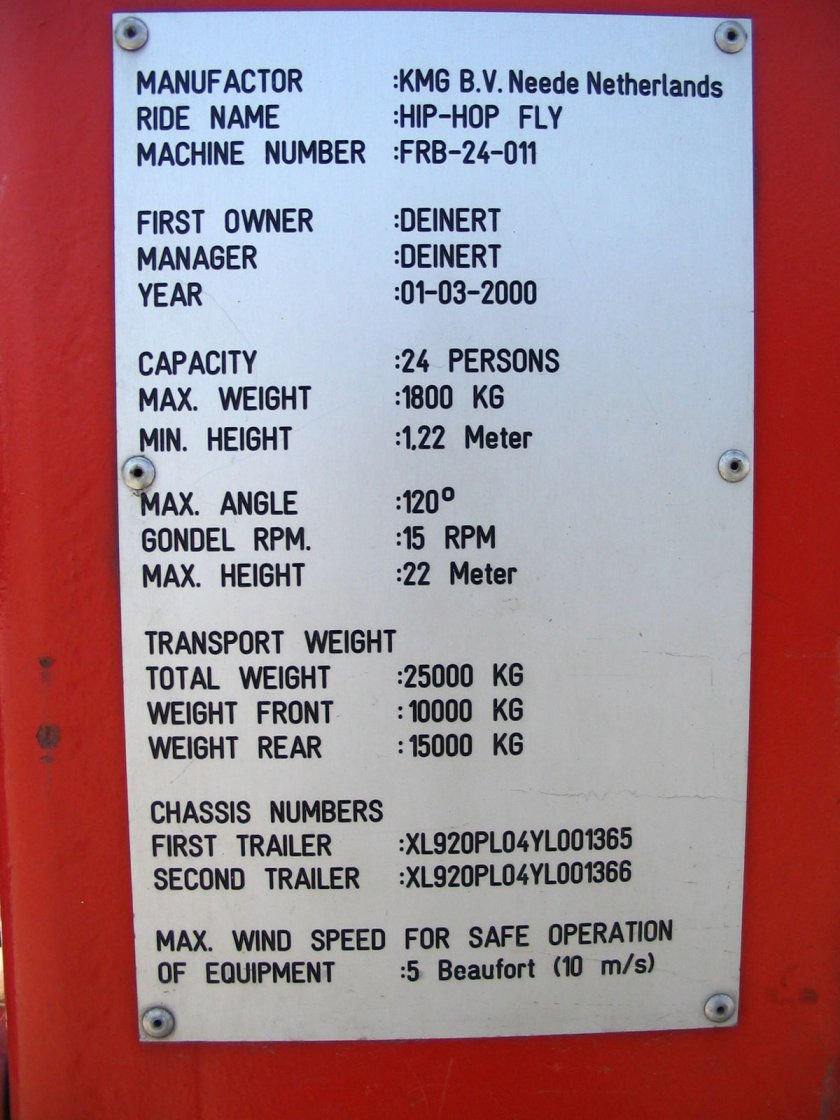 Hersteller: KMG (NL) Typ: Afterburner Baujahr: ? Serialnr.: FRB-24-011 Betreiber: Lagerin, Remo (Rodenbach (D)) ab 2013 ehemaliger Betreiber: Wendler-Deinert (Unna (D)) bis 2009 ehemaliger Betreiber: Noack, Jürgen (Detmold (D)) ab 2009 bis 2012 Premierenplatz: Kamen (D) Webseite: wendler-deinert.de Quelle: K&PR 192, S. 5 (Wechsel zu Lagerin) Ride-Index: Reiseland: Deutschland Last Check 04|2025 11.04.-204.05.2025 Frankfurt - Dippemess Standorte 2018 Gelnhausen - Barbarossamarkt Frankfurt (Main) - Frühjahrsdippemess Standorte 2014 Wiesbaden-Biebrich - Gibber Kerb Standorte 2013 Gelnhausen - Barbarossamarkt (Premiere unter Lagerin) Frankfurt a.M. - Herbstdippemess Standorte 2012 Minden - Maimesse Standorte 2011 Essen-Rüttenscheid - Gruga-Sommerfest Standorte 2010 Iserlohn-Seilersee - Osterkirmes Herne-Crange - Cranger Kirmes Essen-Rüttenscheid - Grugafest Venlo-Blerick (NL) - Mega Kermis Standorte 2009 Dortmund - Karnevalskirmes Hannover - Frühlingsfest Lünen - Himmelfahrtskirmes Neuss-Furth Iserlohn-Letmathe - Kiliankirmes Essen-Rüttenscheid - Gruga-Sommerfest Harsewinkel - Spökenkiekermarkt Standorte 2008 Hannover - Frühlingsfest Standorte 2007 Oberhausen-Sterkrade - Fronleichnamskirmes 06.06. - 11.06. Herne-Crange - Cranger Kirmes Wenden - Wendsche Kärmetze Standplätze 2005 Dortmund - Karnevalskirmes (03.02. - 08.02.) Hannover - Frühlingsfest Oberhausen-Sterkrade - Fronleichnamskirmes (25.05. - 30.05.) Münster - Sommersend (23.06. - 27.06.) Standorte 2004 Dortmund - Karnevalskirmes Oberhausen-Sterkrade - Fromleichnamskirmes Wissen - Schützenfest (10.07. - 12.07.) Bad Wildungen - Kram- und Viehmarkt (15.07. - 18.07.) Süderbrarup - Brarup-Markt (23.07. - 27.07.) Leverkusen-Opladen - Kram- und Trödelkirmes (30.07. - 02.08.) Herne - Cranger Kirmes (06.08. - 15.08.) Rhede - Kirmes (28.08. - 31.08.) Vreden - Volkskirmes (04.09. - 06.09.) Lünen - Lünsche Meß (09.09. - 12.09.) Monheim - Septemberfest (17.09. - 19.09.) Bottrop - Herbstkirmes (25.09. - 28.09.) Unna - Katharinenkirmes (29.10. - 01.11.) Standorte 2003 Unna - Katharinenkirmes Standorte 2002 Recklinghausen - Palmkirmes (16.03. - 24.03.) Hannover - Frühlingsfest (30.03. - 21.04.) Lingen/Ems - Frühjahrskirmes (03.05. - 07.05.) Köln-Porz - Inselfest (09.05. - 12.05.) Bad Lippspringe - Rhine-Army-Sommer-Show (18.05. - 20.05.) Waldbröl - Kirmes und Stadtfest (24.05. - 27.05.) Standorte 2001 Münster - Frühjahrssend (22.03. - 27.03.) Recklinghausen - Palmkirmes (31.03. - 08.04.) Hannover - Frühlingsfest (14.04. - 06.05.) Solingen-Ohligs - Dürpelfest (18.05. - 20.05.) Cloppenburg - Juni-Markt (25.05. - 28.05.) Lübbecke - Blasheimer Markt (06.09. - 09.09.) Melle-Gesmold - Kirmes (15.09. - 17.09.) Haan - Haaner Kirmes (22.09. - 25.09.) Oldenburg - Kramermarkt (28.09. - 07.10.) Dülmen - Viktor-Kirmes (12.10. - 15.10.) Lippstadt - Herbstwochen (20.10. - 28.10.) Osnabrück - Herbstjahrmarkt (02.11. - 11.11.) Unna - Katharinenkirmes (02.11. - 05.11.) Rheda-Wiedenbrück - Andreaskirmes (16.11. - 19.11.) Standorte 2000 Rheine - Kirmes In Ahnlehnung an die "Achterbahn der Woche" würde ich gerne etwas Ähnliches für den Bereich der Kirmes mal starten: das Karussell der Woche. Gefragt sind jeweils Meinungen, Bilder, Geschichten über ein bestimmtes Fahrgeschäft. Aller Anfang ist schwer, deswegen denke ich mal A wie Afterburner könnte nicht verkehrt sein. Also starten wir mit einem Afterburner. genauer gesagt mit einem, von dem ich ein paar Bilder besitze und der den onridern von den Treffen letztes Jahr in Crange und Soest noch bekannt sein dürfte: Der Hip Hop Fly der Schausteller Wendler-Deinert aus Unna. Der Hip Hop Fly ist eine Schwingschaukel aus holländischer Produktion. Geneuer gesagt ist die Typenbezeichnung für dieses Karussell "Afterburner", der Hersteller ist die Firma KMG. Der Hip Hop Fly ging im Jahre 2000 an den Start und wird seitdem von den Schaustellern Wendler-Deinert betrieben. Für Infos und Bilder kann man sich auch auf der Webseite des Schaustellers Deinert informieren. wendler-deinert.de Onride-Treffen in Soest ![]() Quelle: people.freenet.de ahksp11.jpg Hip Hop Fly auf der Katharinenkirmes 2003 in Unna ![]() Quelle: germancoaster.de unna-katharinenkirmes-02.jpg ![]() Quelle: germancoaster.de unna-katharinenkirmes-07.jpg Onride-Treffen auf der Cranger Kirmes 2003 Wie urteilt ihr über dieses Fahrgeschäft? Alle Karussells der Woche Bilanz reisender KMG Afterburner |