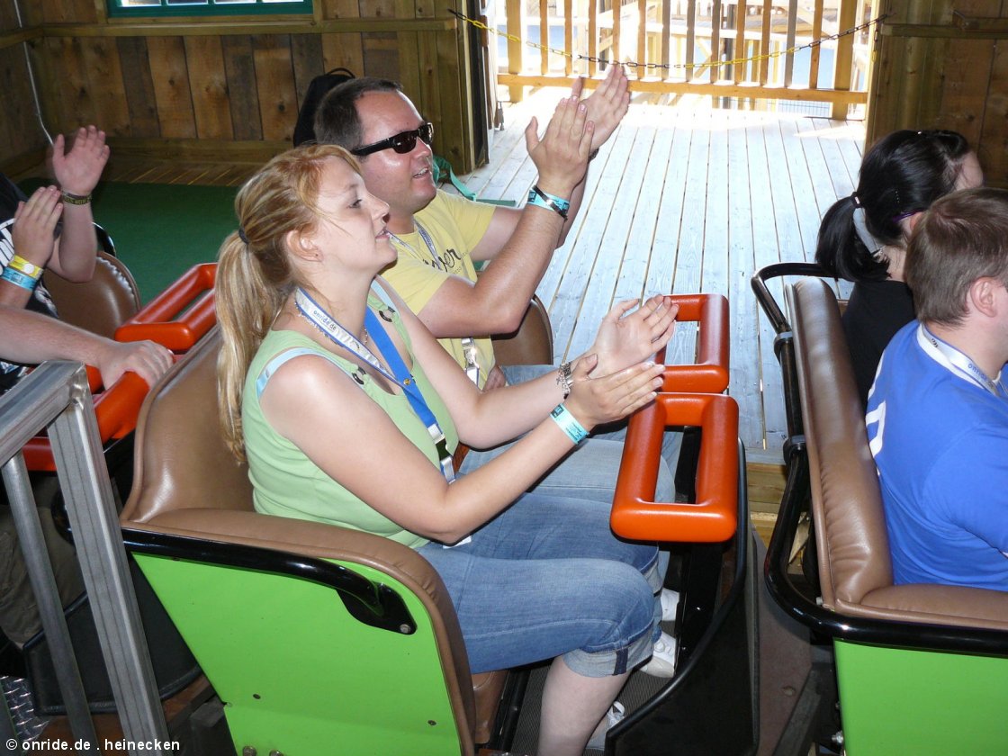 Tag 2 - Fährüberfahrt, Tag auf See Tag 3 - Tykkimäki Tag 4 - Power Park Tag 5 - Linnanmäki Tag 6 - Särkänniemi Nachdem nun der ganze Haufen also am vergangenen Abend im Wickingerrestaurant eingefallen war und dort wie die Heuschrecken die Küche leergefuttert hatte, sich superleckeres Honigbier in die Figur schüttete und auch die letzten Reste Teer-Eis nicht verschont geblieben waren, traf man sich schon früh morgens um sich auf den Weg zum heutigen Tagesziel zu machen. Die Hotelmannschaft hatte zuvor gezeigt, was man in Finnland unter Gastfreundschaft versteht und extra für uns das Frühstücksbuffet eine Stunde vorzeitig eröffnet, so dass niemand hungrig in den Bus steigen musste. Heute erwartete uns eine der längsten Fahrstrecken der Tour und zugleich das nördlichste Ziel, welches onride.de je auf einer Tour angesteuert hatte. Power Park So ziemlich jeder Tourteilnehmer hätte hier wohl eher niedrige Temperaturen erwartet, statt dessen war es hier sonnig und warm. Beste Bedingungen also, um sich in einen Feuerfesten Anzug zu zwängen und einige Runden auf der Kartbahn zu drehen - was mir heute erspart blieb. Für heute hatten ein paar Leute auch den "Day of the crazy hats", den Tag der dummen Kopfbedeckung ausgerufen, nachdem der Shop vor den Toren des Parks beste Voraussetzungen dazu geboten hatte. Kein Unterschied zu sonst, oder? Ui