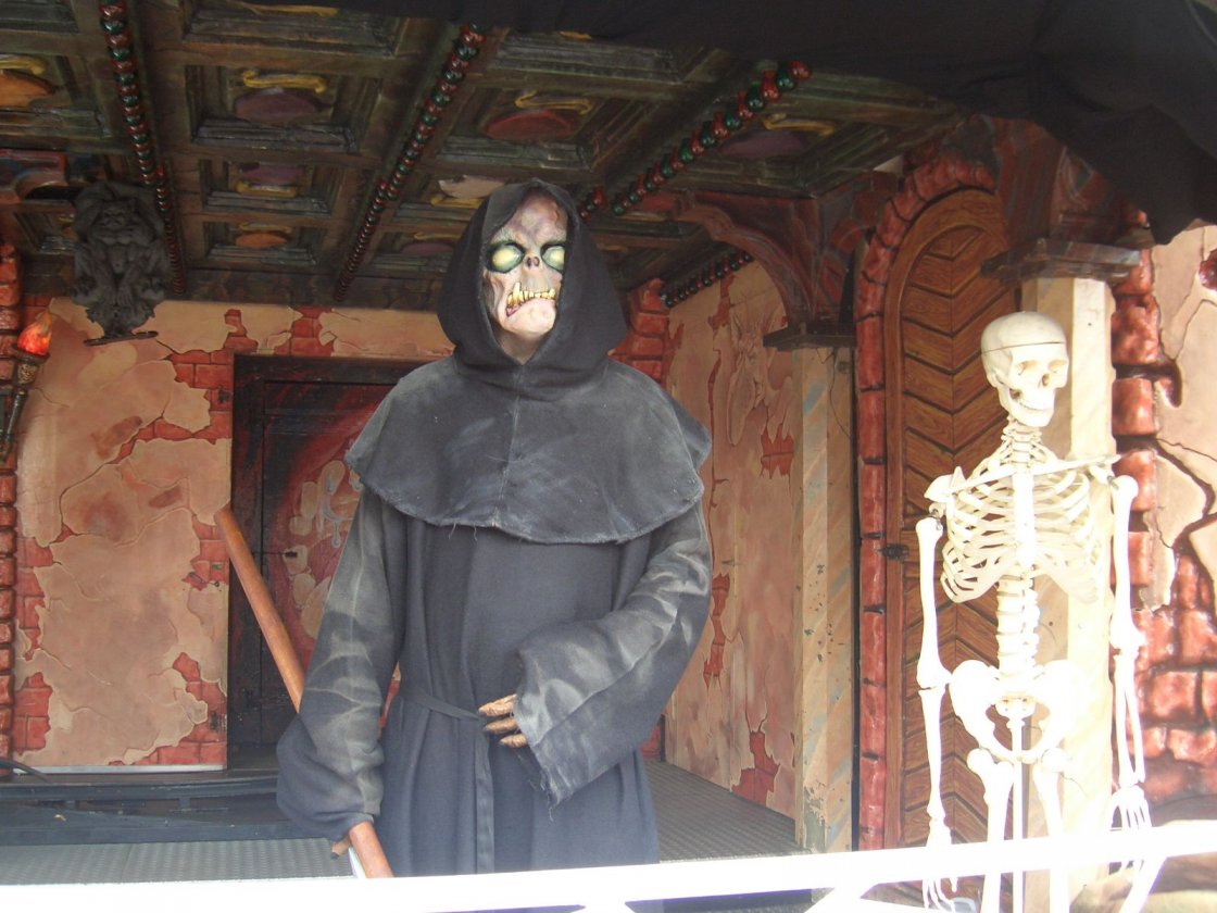 Ich war im Geisterschloss auf dem Münchner Oktoberfest und da war im ersten Teil in der unteren Etage ein Live Actor, dann wo man einmal auf dem Balkon fährt und dann kurz vorm Schluss einer mit ner Kettensäge.