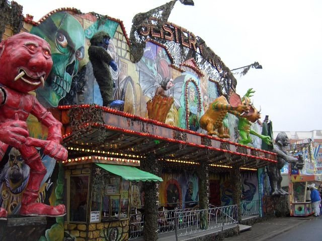 Hersteller: Mack (D) Typ: Geisterbahn Premiere: 1968 Betreiber: Filder, Robert (Karlsruhe (D)) ehemaliger Betreiber: Kinzler ehemaliger Betreiber: Stey ehemaliger Name: Geister-Grotte ehemaliger Name: Satanicum nur 2007 Frühjahr Webseite: geister-grotte.com Quelle: K&PR 119, S. 4 KPR 130, S. 7 (Umbenennung Satanicum in Monsterhaus) Ride-Index: ride-index.de Reiseland: Deutschland Last Check: 05|2024 18.05.-26.05.2023 Worms - Pfingstmarkt Standorte 2018 Karlsruhe - Frühlingsfest Standorte 2015 Kamen - Frühjahrkirmes Ketsch - Backfischfest Standorte 2013 Rüsselsheim - Rüsselsheimer Kerb Wiesbaden-Biebrich - Gibber Kerb Standorte 2012 Eisleben - Frühlingswiese Standorte 2011 Bruchsal Standorte 2009 Heilbronn - Maifest Standorte 2007 Schriesheim - Mathaisemarkt Karlsruhe - Frühlingsfest Eppingen Lörrach Brühl Fellbach Schwäbisch Gmünd Karlsruhe Standorte 2006 Würzburg - Frühjahrsvolksfest Karlsruhe - Frühlingsfest Größe: 20 x 14 m Die Fahrt ist nicht kurz aber auch nicht lange und verläuft auf einer Etage. Ich denke mal, dass es eine Mack-Geisterbahn ist. Die Bahn hat ca.10 sehr schöne Figuren. Zur der Zeit, wo ich drinne war, waren zwei lebende Geister drinne. Einer kam von links und einer von rechts. Die hatte man aber schon gehört, weil sie sich unterhalten hatten. Auf dem Frühjahrsvolksfest Würzburg 2006: Bilanz der in Deutschland reisenden Geisterbahnen. |