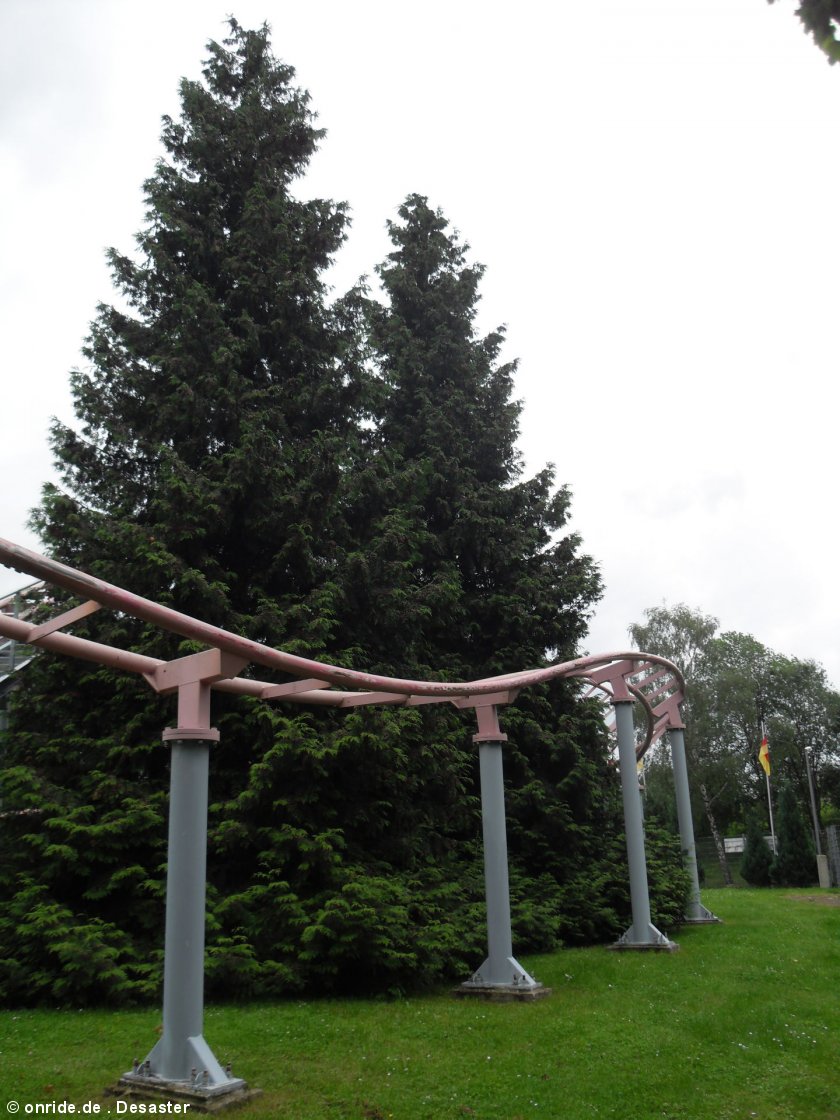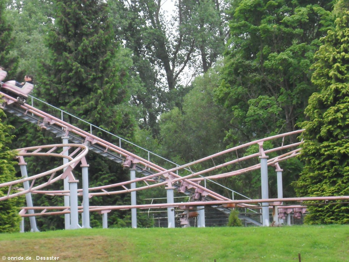 An dieser Stelle wollen wir natürlich nicht die Achterbahn des Parks verschweigen, die ziemlich abseits im Park liegt. Man wird wissen, warum. Ein Traum in Schweinchenrosa und Babyblau. Das Teil geht gar nicht. Optisch der reinste Supergau. Fahrtechnisch kann ich jetzt nicht beurteilen da ich nicht gefahren bin. Die letzte Fahrt im Jahr 2005 hat mir gereicht.
