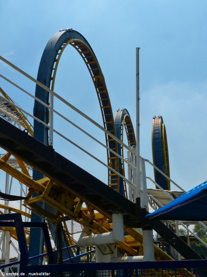I - Parque Bicentenario II - Teotihuacan III - Puerta Vallarta & Ixtapa IV - Six Flags Mexico Klassiker, meine #100 und eine Menge Nostalgie erwartete mich nur einen Tag nach SF Mexico. Im Gegensatz zu Six Flags liegt die Feria de Chapultepec sehr zentral - im gleichnahmigen Park Chapultepec, Heimat eines spanischen Schlosses, Zoos und unzähligen Museen. Chapultepec ist die grüne Lunge Mexico Citys, Erholungsgebiet und Touristen Magnet und lohnt sich nicht nur wegen der Feria zu besuchen. Für mich an dem Tag keine Option, erstens musste ich morgens den Dortmunder Erfolg gegen die Freiburger im Internetradio hören, zweitens traf ich nach meinem Besuch des Parks meine spätere Freundin und heutige Exrfeundin. Am besten kommt man natürlich mit der Metro hin, bis Chapultepec (pinke Linie) und dann mit dem Kombi-Microbus Richtung Feria. Oder direkt um die Ecke aussteigen an der Orangende Linie Constituyentes und dann hinlaufen, was auf jeden Fall die bessere Variante wäre. Denn a) muss man den Mikrobus im Busdschungel erstmal finden, b) hält er einfach irgendwo und man muss raten, ob es gerade "seine" Station ist. Zum Glück hatte ich noch eine andere Person dabei, die dort auch hinwollte und konnte so mit aussteigen. Kurz nach Parköffnung um 11 Uhr war ich dann vor Ort. Das Ticket kann man sich hier für 200 Pesos lösen, was ungefähr 12 Euronen entspricht. Auch hier müssen Getränke und Essen draußen bleiben, die Kamera ist hier - Gott sei Dank - kein Problem. Der Park ist nur auf den ersten Blick Übersichtlich, links eingekesselt von den beiden Schwarzkopfcoastern, rechts eine riesige Rutschbahn, dahinter der Eingang des Woddies. Zwischen den 3 Achterbahnen viele Kirmes Rides, unter anderem Simulator, Mackscher Musikexpress und vieles mehr. Um in den hinteren Parkteil zu gelangen muss man den Weg unter der Holzachterbahn erstmal finden - beide Wege zu der Drehenden Maus sind so versteckt die die Toiletten. Der ganze Park wirkte beim Betreten ein bisschen wie in Roller Coaster Tycoon entworfen. Die Vorfreude jedenfalls riesig - ging es erstmal unter der Holzachterbahn durch zur Wilden Maus um meinen CC auf 98 zu erhöhen und später dann die freie Auswahl zu haben. Daneben stand ein Horrormaze, das ich aufgrund der Erfahrungen am vorigen Tag und Zeitmangel leider ausgelassen habe. Generell habe ich mich aufs Achterbahn fahren dort beschränkt. Neben einer Wildwasserbahn und eben dem Haus hätte mich aber auch nichts gereizt. Der Free Fall Tower war nicht in Betrieb. Nun stand ich vor der Entscheidung: Was für die 100? Da wäre der Möbius-Woody Montana Rusa, den ich damals schon bei "Giganten aus Holz und Stahl" bewundert habe. Links Einsteigen, rechts Aussteigen, ein Wunder der Technik. Dann gäbe es Cascabel einen herrlich alten Schwarzkopf Shuttle Loop mit klassischem Schwungrad-Antrieb. Und dann steht daneben noch Montana Infinitum, ebenfalls aus dem Hause Schwarzkopf und in Deutschland geläufig unter dem Namen "3er Looping". Welch Auswahl,aber da Montana Infinitum noch nicht lief ich mich aber auf einen Schwarzkopf festgelegt hatte, nahm ich erst die Fahrt auf einer der beiden Spuren der Holzachterbahn um später zu Cascabel zu gehen. Montana Rusa, zu deutsch einfach Achterbahn: Ein Möbius Coaster, zwei Spuren, ein Rennen....Pustekuchen, die Bahn lief im Ein-Zug Betrieb mit lächerlichen Kapazität. So wurden 4 Züge gleich zur 30 Minüten Wartezeit in einem sonst leeren Park. Natürlich kann man die Besucher auch erst nachdem alle die Station verlassen haben erst die treppen runter steigen lassen. Selbst im Port Aventura waren sie da schneller. Der Wartebereich der Bahn liegt hier über der eigentlichen Stadtion, was mich erstmal verwirrt hat. Ich habe den Eingang natürlich auf Schienenlevel gesucht. Getrennte Wartebereiche gibt es nicht, am Ende der Schlange entscheidet es sich dann ob es links oder rechts runter geht. Endlich drin, eingestiegen bin ich auf der rechten Seite. Bei aller Vorfreude hatte ich vergessen, dass die Kiste mit seinen 39 Jahren ja uralt ist und mich ganz schön verhauen könnte. Ist mir dann im First Drop dann schmerzlich in Erinnerung gerufen worden - das war aber dann auch der einzige wirklich schlimme Schlag auf die Wirbelsäule, danach ist die Bahn in Ordnung und innerhalb der normalen roughness eines Woodies. Einen Möbius im Ein-Zug Betrieb fahren zu lassen leuchtet mir dennoch absolut nicht ein, denn damit beraubt man sich allem was die Bahn ausmacht. Wenigstens hat man vom Lifthill einen grandiosen Blick auf Mexico City und die umliegenden Berge der Stadt. Immerhin gab es während der Zeit gute Nachrichten, Montana Infinitum drehte fleißig ihre Testrunden und die Warteschlange wurde prompt geöffnet als ich die Holzachterbahn verlassen habe. Zweiter Zug des Tages, Reihe 1! Doch bevor man in den Wagen einsteigen darf, wird sich erst in Reih und Glied aufgestellt und den Sicherheitsanweisungen gelauscht. Dann wird der Schultergurt angelegt und der Beckenbügel festgedrückt. Der Gurt wird so stark zusammengezurrt, dass man kaum aufrecht sitzen kann - diese Umrüstung war unnötig und unangenehm. Dann treibt endlich der Reibradantrieb den Zug mit hoher Geschwindigkeit nach oben - es bleibt kaum keine Zeit sich auf das folgende Einzustellen. Nach einem schönen First Drop, der einen gerade in den hinteren Reihen in die tiefe zieht, reißt der Zug einen permanent in die andere Richtung. Enge Loopings und Radien in die Kurven lassen keinen Moment zum Luftholen. Klasse! Montana Infinitum läuft dabei immer noch so smooth, dass man das Alter der Bahn total vergisst. Die Bahn ist deutlich wilder und intensiver als ich mir es vorgestellt habe und steigt weit oben in meine Coastercharts ein. Leider ist nur noch ein Zug in Ordnung, die anderen sind großteils Demontiert und werden als Ersatzlager genutzt. In dieser Hinsicht hat mich der Zustand der Bahn dann doch etwas schockiert. Nächstes Ziel ist dann Cascabel - auf den Flywheel Launch hab ich 