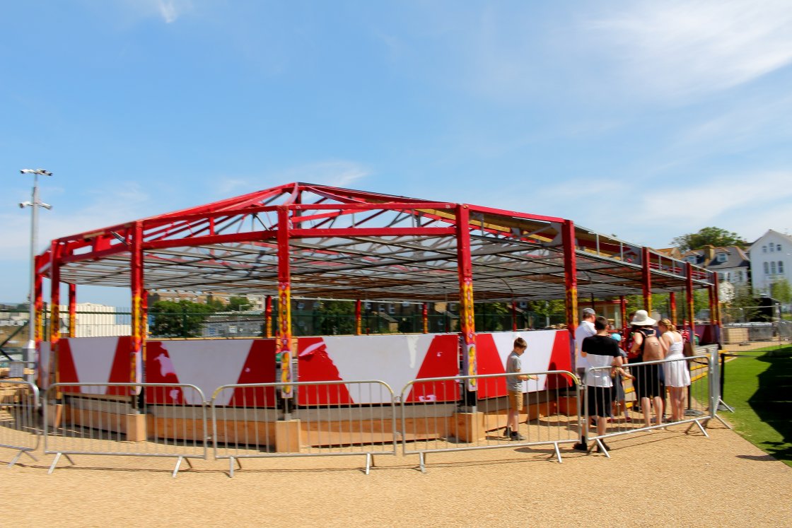 Der zweite Tag der Tour führt uns zunächst auf die ehemalige Isle of Thanet, die bis in das 15. Jahrhundert hinein noch durch den Wantsum Kanal vom Festland abgetrennt war, dann jedoch versandete. An der nördlichen Küste und am äußersten östlichen Zipfel dieser alten Insel in der Grafschaft Kent liegt die kleine beschauliche Stadt Margate mit knapp 60.000 Einwohnern. Von unserem Nachtdomizil in Ilford brachen wir nach einem guten englischen Frühstück gegen 9 Uhr in Richtung Südosten auf. Zwischen uns und Margate lag nun noch ein kleiner Fluss namens Themse, der überquert werden musste. Der Weg führt dabei über die zum Dartford Crossing gehörende Queen Elizabeth II Brücke. Die 75 Meter aus dem Fluss ragenden Pylonen lassen die Brücke schon von weitem ziemlich imposant wirken. Zwischen 6 und 22 Uhr kostet das Dartford Crossing 2,50 Pfund Maut, für die gesparte Fahrtstrecke und –zeit gut investiertes Geld. Zumal Marvin und Alex die Bezahlung per Smartphone schnell und ohne Probleme erledigen konnten. Nach knapp 1 ½ Stunden Fahrt erreichten wir dann die Küstenstadt. Uns interessierte aber weder die Altstadt noch die Bibliothek. Auch die Strandpromenade konnte uns nicht zu mehr als einer kurzen Stippvisite begeistern. Der links sichtbare Lido bietet aber den ersten Bezugspunkt zum ersten Park des Tages. Dieser wurde nämlich von John Henry Iles 1926 erbaut, der sechs Jahre davor für einen Meilenstein in seinem Park sorgte. Zu diesem dann gleich mehr. Zwei Tage vor unserem Besuch startete hier übrigens Ross Edgley zu seinem Abenteuer, die Hauptinsel von Großbritannien schwimmend zu umrunden. Am vergangenen Sonntag erreichte er dann nach 157 Tagen wieder den Strand von Margate. Unser Interesse galt aber vielmehr dem Freizeitpark, den der Herr Iles 1919 aufgekauft hat. Hier zu sehen ist das zugehörige Kino aus dem Jahr 1935, das 1923 als Varieté Theater mit 900 Plätzen öffnete. 1992 wurde es in die Liste der Grade II-Bauwerke aufgenommen und darf daher nicht abgerissen oder versetzt werden. Ein Schicksal, das eine andere Sehenswürdigkeit zum Glück auch ereilt hat, denn wie der Park war auch das Kino von einer Schließung 2007 betroffen, wurde aber bis zum letzten Jahr restauriert. Der Eingang zum Park ist etwas versteckt in einer Seitenstraße zu finden. Hm, weswegen sind wir wohl hier … Und damit herzlich willkommen zum ersten Bericht auf onride aus dem schönen Dreamland in Margate! Ein Park, der so viele Geschichten zu erzählen und zahlreiche Attraktionen erlebt hat, dass ich auf meine Parkvorstellung verweise, wo ich für Interessierte meine bislang ausführlichste geschichtliche Vorstellung geschrieben habe. Ich konnte mich durch die ganzen Internetseiten nur so hindurchlesen, weil mich die Faszination der Anwohner und zahlreicher Unterstützer mehr als nur fesselte, weswegen ich den Park auch unbedingt besuchen wollte. Mit Marvin und Alex gab es im Vorfeld einen kurzen Austausch, ob wir ggf. Great Yarmouth anfahren, haben uns dann aber auch in Anbetracht eines zweiten Ziels an diesem Tag glücklicherweise für das Dreamland entschieden. Great Yarmouth wird aber auch noch irgendwann folgen. Zu Beginn des neuen Jahrtausends verkauften die damaligen Besitzer nach und nach ihre Attraktionen und es sammelten sich freie Flächen an. Gerüchte machten folgend die Runde, dass der Park sein Ende erreicht haben könnte, was Freizeitparkethusiasten und Historiker dazu veranlasste, eine Kampagne zu starten, damit auch die altehrwürdige Scenic Railway als Grade II-Bauwerk geschützt wird. Im März 2002 endete dies mit Erfolg und die Holzachterbahn wurde als erste ihrer Art in diese Liste aufgenommen. Trotzdem wollten die Besitzer das Gebiet zum Wohnungsbau anbieten, weswegen Anhänger erneut auf die Barrikaden gingen und 2003 die „Save Dreamland Campaign“ gründeten, die schnell 13.000 Unterstützer auf der Welt ansammelte und auch Unterstützung durch die englische Verwaltung der in Staatsbesitz befindlicher Denkmäler, der English Heritage, bekam. Schlussendlich wurde der Park 2005 geschlossen und das Gelände verfiel zusehends. Aufgrund des Erfolgs der Kampagne wurde 2007 eine eingetragene Wohltätigkeitsorganisation namens Dreamland Trust gegründet, der nicht nur zahlreiches Geld zukam, sondern dem auch einige ältere Fahrgeschäfte gespendet wurden. Nachdem die Scenic Railway am 7. April 2008 Opfer eines Brandanschlags wurde, bekam der Dreamland Trust weiteres Geld zugesprochen, um die Achterbahn zu restaurieren und das Gelände wieder als Freizeitpark und lebendes Museum mit nostalgischen Fahrgeschäften zu eröffnen. Dafür ging das Gelände durch einen Gerichtsbeschluss in öffentliche Hand über. Im Juni 2015 wurde dann der Traum der Bevölkerung wahr und der Park eröffnete, wenn auch zunächst mit einigen Problemen, wieder als Dreamland. Durch diesen Kampf war mir der Park direkt von Anfang an sehr sympathisch, zumal ich alte Attraktionen sehr mag. Ich bin gespannt, was sich dort noch über die Jahre entwickeln wird. Leider habe ich vergessen nach der eingelagerten Holzmaus zu fragen, aber ich habe sie zumindest einmal auf einem Bild neben der Scenic Railway liegend gesehen. Ich würde allerdings keine zu großen Hoffnungen darin legen … Aber zurück zum Park, der mit 15 Pfund Eintritt mehr als nur günstig ist. Im Eingangsgebäude bekamen wir unsere Wristbänder überreicht. In Richtung Park laufend ist links diese Roller Disco zu sehen. Auf der anderen Seite sind ein großer Ballroom und die Hall by the Sea zu finden. Dort sind in den 60ern Rockgrößen wie die Stones oder auch The Who aufgetreten. Zu dieser Zeit war das Dreamland eine der besten Veranstaltungsorte für Musikkonzerte außerhalb Londons. Das Freigelände wird dann direkt beim Riesenrad betreten. Wo könnte es uns zuerst hingezogen haben? Beginnen möchte ich aber mit einer Parkrunde entgegen dem Uhrzeigersinn in südlicher Richtung. Im Bereich um das Riesenrad finden sich die Gallope